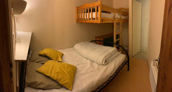 L’une des chambres est équipée d’un grand lit et d’un lit une personne. L’autre chambre possède un grand lit et deux châlits de deux lits superposés (donc 4 lits en tout). La salle de douche adjacente possède une douche et un lavabo. Les toilettes sont indépendantes.